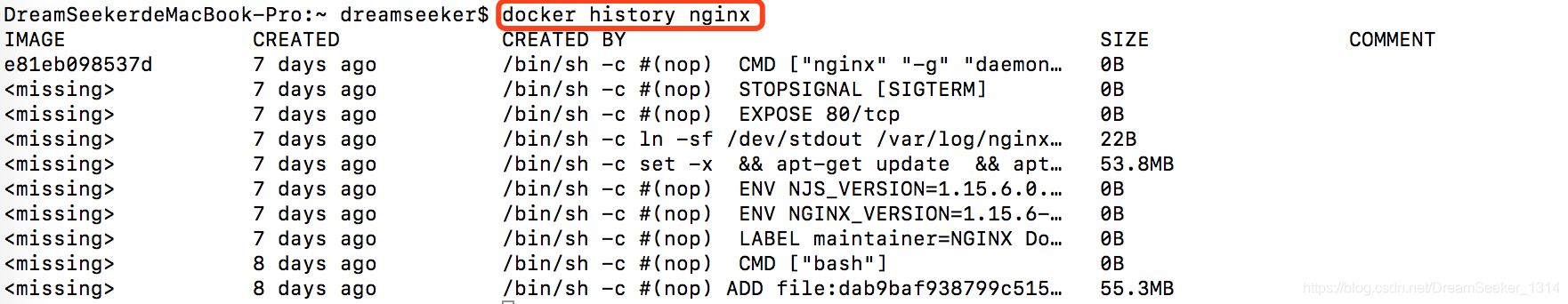 使用history子命令,该命令将列出各层的创建信息。docker history nginx