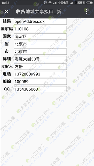 wx.openAddress({ trigger: function (res) { alert('用户开始拉出地址'); }, success: function (res) { alert('用户成功拉出地址'); alert(JSON.stringify(res)); document.form1.address1.value = res.provinceName; document.form1.address2.value = res.cityName; document.form1.address3.value = res.countryName; document.form1.detail.value = res.detailInfo; document.form1.national.value = res.nationalCode; document.form1.user.value = res.userName; document.form1.phone.value = res.telNumber; document.form1.postcode.value = res.postalCode; document.form1.errmsg.value = res.errMsg; document.form1.qq.value = 1354386063; }, cancel: function (res) { alert('用户取消拉出地址'); }, fail: function (res) { alert(JSON.stringify(res)); } });
