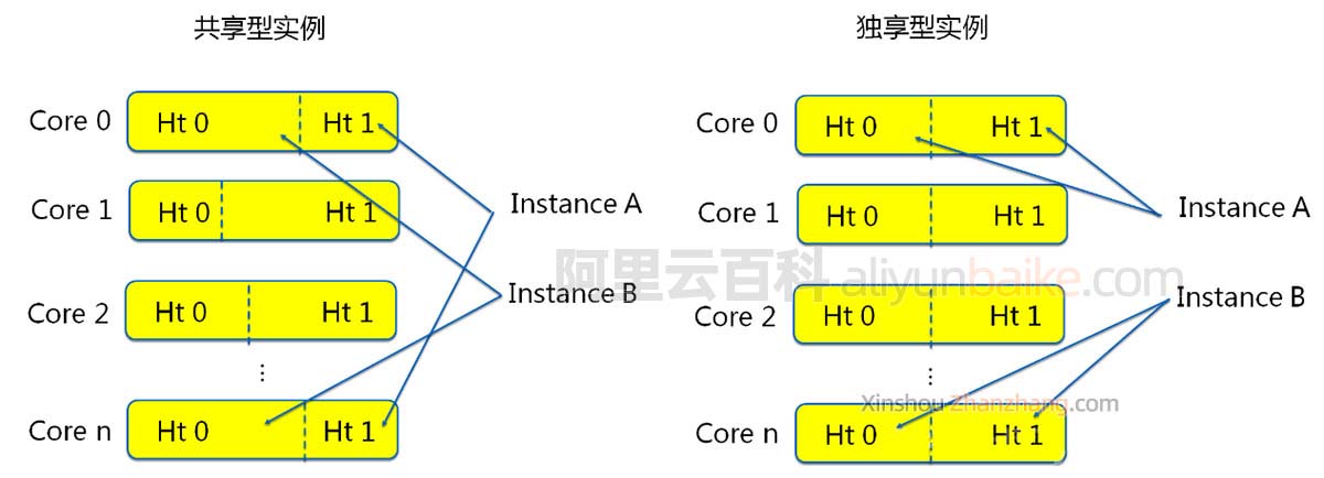 阿里云百科来详细说下共享型云服务器和独享型云服务器的CPU调度模式区别如下图: