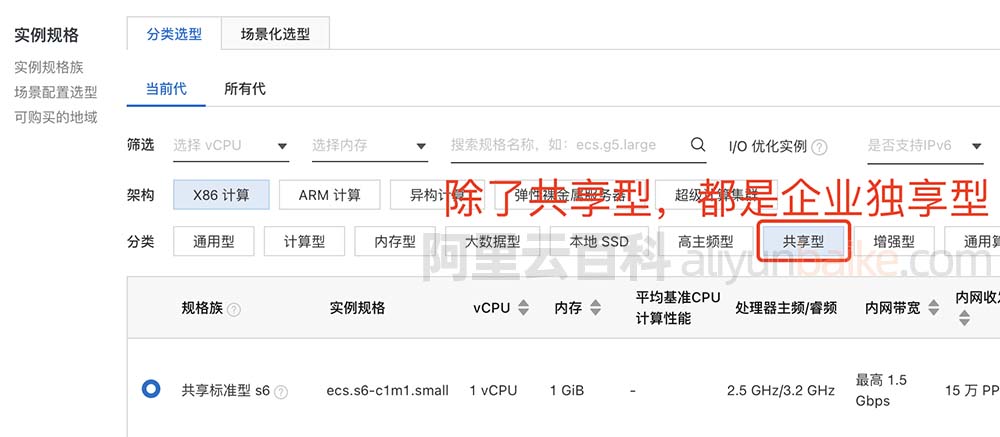 以上是阿里云百科分享的阿里云共享型云服务器和独享型服务器区别,区别在于CPU计算性能稳定性,目前共享型只有t6、t5、s6、n4、mn4、xn4、e4,剩下的都是企业级独享型云服务器。
