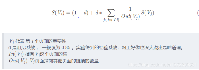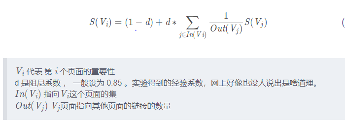 此时就形成了PageRank的基本思想,同时考虑到一个页面指向多个其他页面,那就将该页面的权重进行平分,就成了公式1。