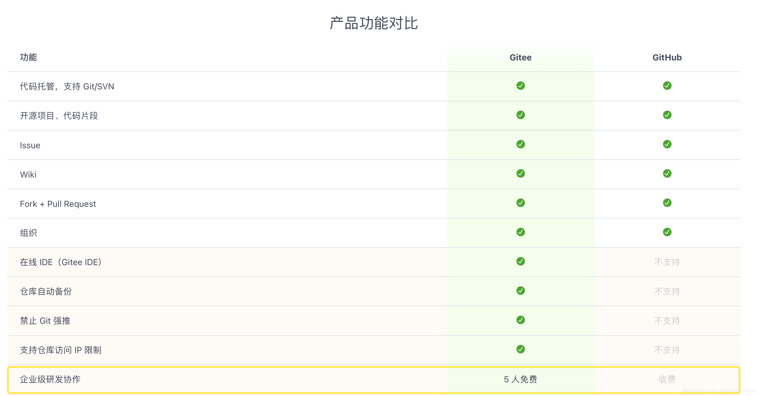 gitee也就是码云,中国自己的服务器。我从gitte官网截取了gitee和github的对比图: