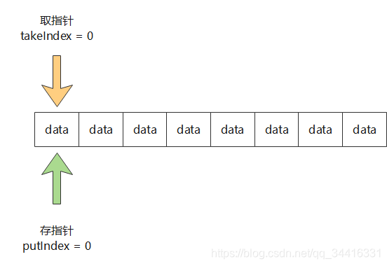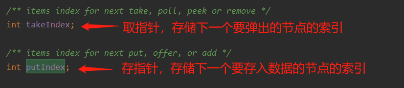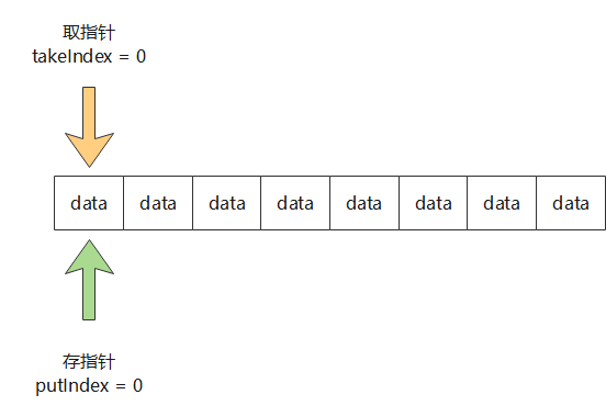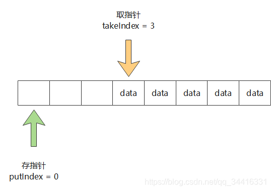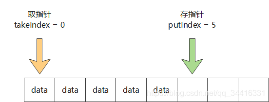 而随着元素被推入队列,存指针始终是下一个要存入数据的数组索引,图中 putIndex = 5。