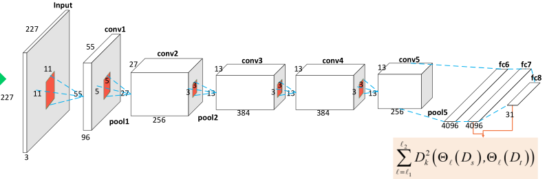 输入时候用有标的源域样本训练AlexNet,然后训练完成后,加入目标域样本,只用MMD更新最后两层的权重。