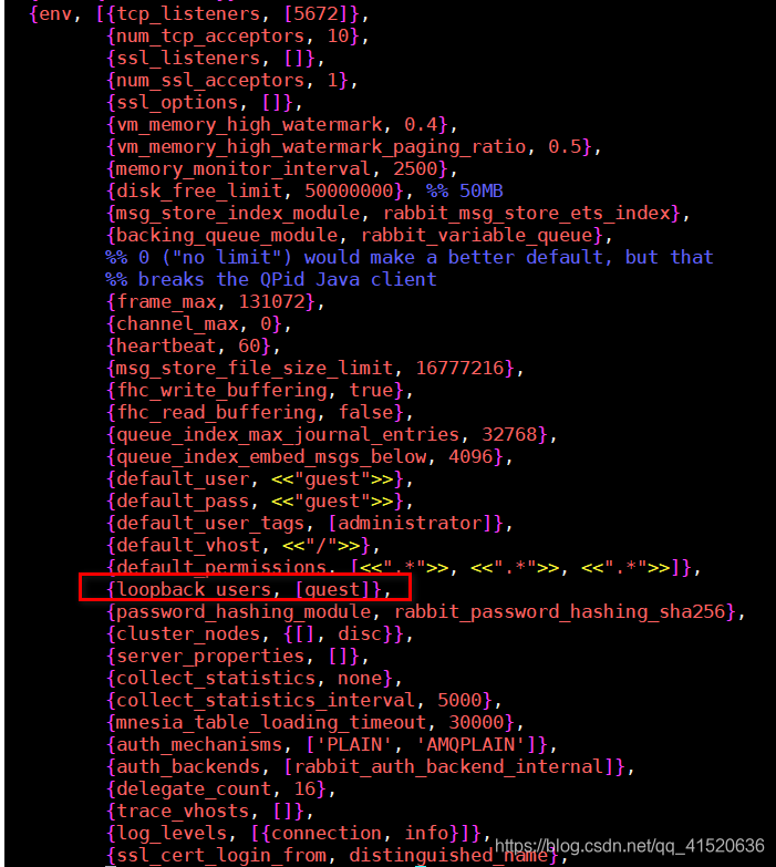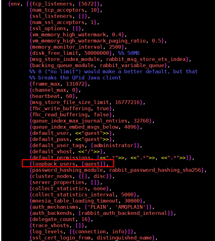 vim /usr/lib/rabbitmq/lib/rabbitmq_server-3.6.5/ebin/rabbit.app开启用户