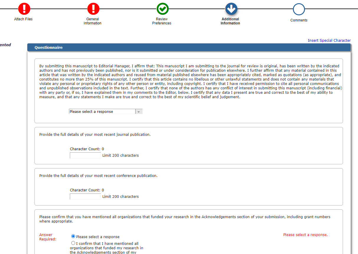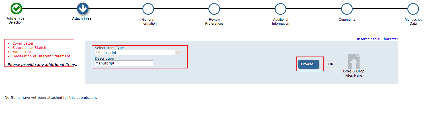 4.这里需要上传四个文件,“Cover Letter”就是写个编辑的信,大概就是简单说一下你的论文,笔者上传了自己写的模板Cover letter。“Declaration of Interest Statement”大概就是说明你的论文没有抄袭没有多投等等,这个文件《C & S》是有个现有文件的,笔者也是找了好久才找到,点击链接下载Declaration of Interest Statement。“Manuscript”自然就是你的论文手稿了。这里需要说明的是该期刊没有给出明确的模板,而是作者的论文被接受后再修改排版。不过也对文章的内容作出了部门要求,链接投稿指南。最后就是“Biographical Sketch”,就是作者自传,每位作者上传一张照片,然后介绍一下,这个读者参看已经发表了文章就好。