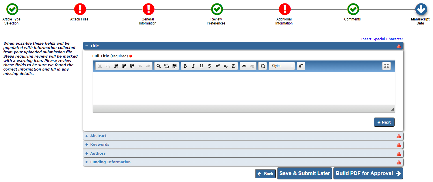 9.最后一步需要操作的稍微多一点。首先是文章的标题,如果你在第二步上传手稿的时候上传的是Word文件的话,那这里Title,Abstract和Keywords会自动生成。没有自动生成的话就手动粘贴复制吧。Authors信息如实填写就好。最后是基金信息,这和要认真填好,别搞错了。各项确认后就可以生成PDF提交了。
