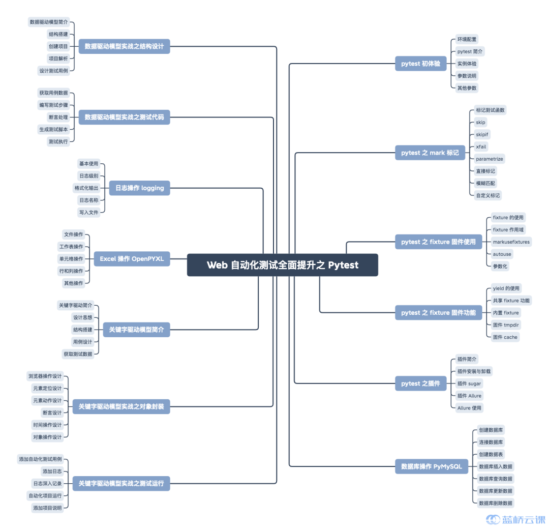 蓝桥云课上线了一门《Web 自动化测试全面提升之 Pytest》,通过 13 个实验带你系统学习 Pytest,逐步掌握 Pytest 框架、PyMySQL、logging 和 OpenPYXL、以及自动化测试中数据驱动模型和关键字驱动模型等。