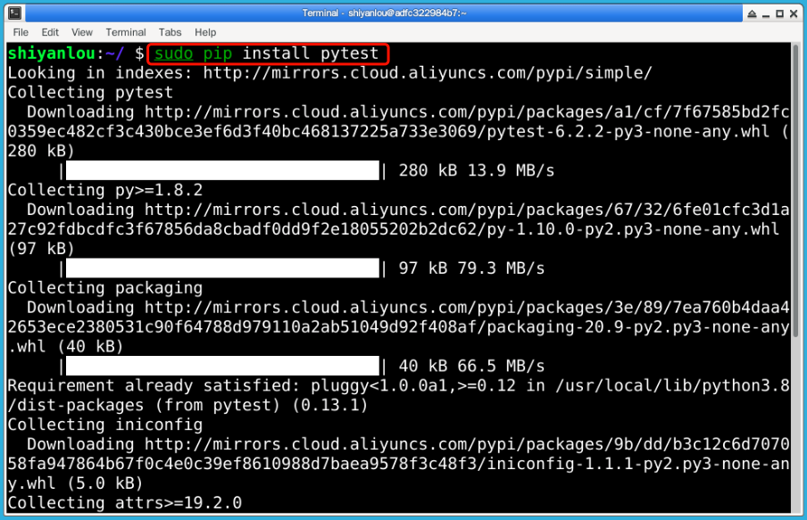 打开 Xfce 终端,输入命令 sudo pip install pytest 然后回车,操作截图如下: