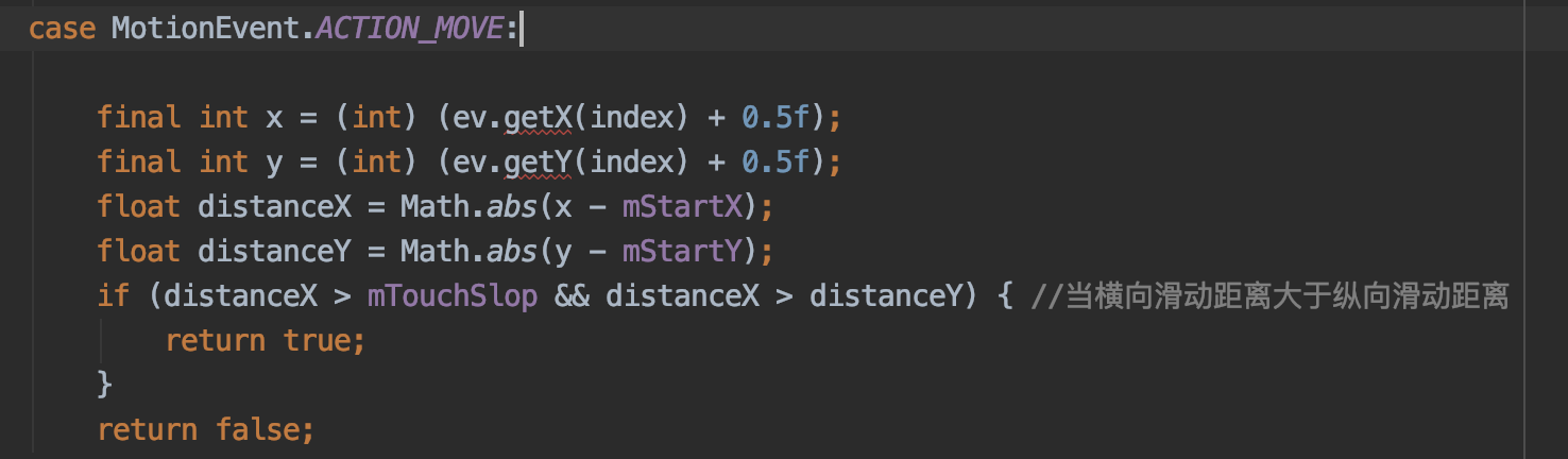 了解完事件分发机制,再回看一下上面的滑动冲突,横向滑动recycleview中,嵌套了竖向的recycleview,当横向滑动时,不流畅。需求中,是只需要横向滑动,而竖向recyclerview不必滑动,于是,重写了横向recyclerview的onInterceptTouchEvent方法,主要逻辑在这: