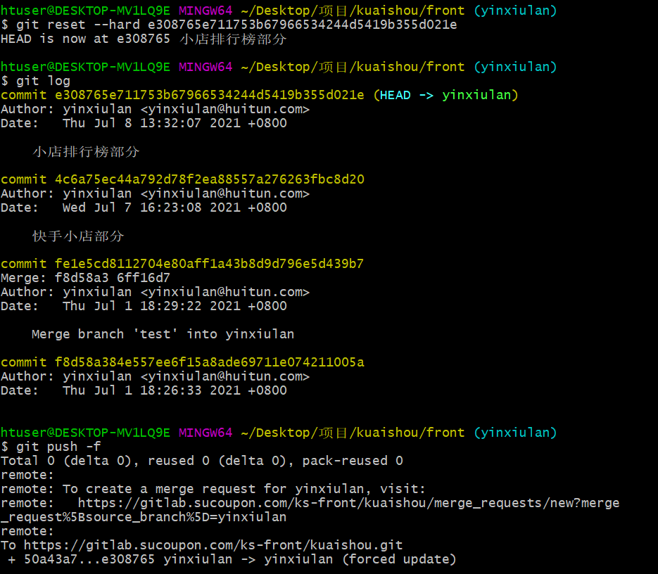 git push -f 强制回退远程仓库到当前版本