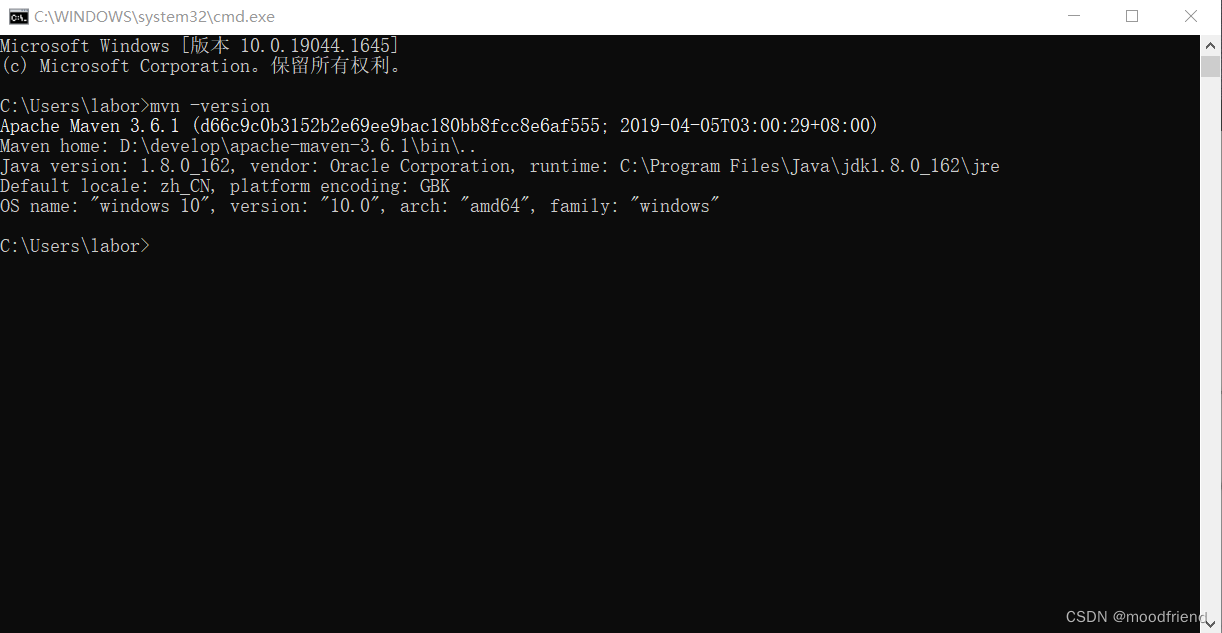 在命令行中输入mvn -version命令,显示Maven的版本号安装即为成功