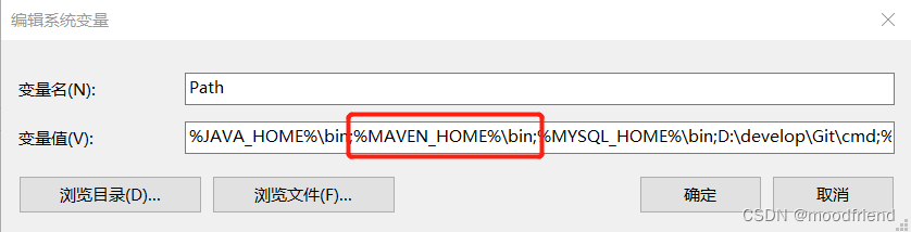 第四步:在系统变量下找到Path,选中进行编辑,添加%MAVEN_HOME%\bin;(注意如果跟我的格式一样就添加英文分号,如果是分开展示的就不用加分号了,确定的时候系统会默认加上分号)
