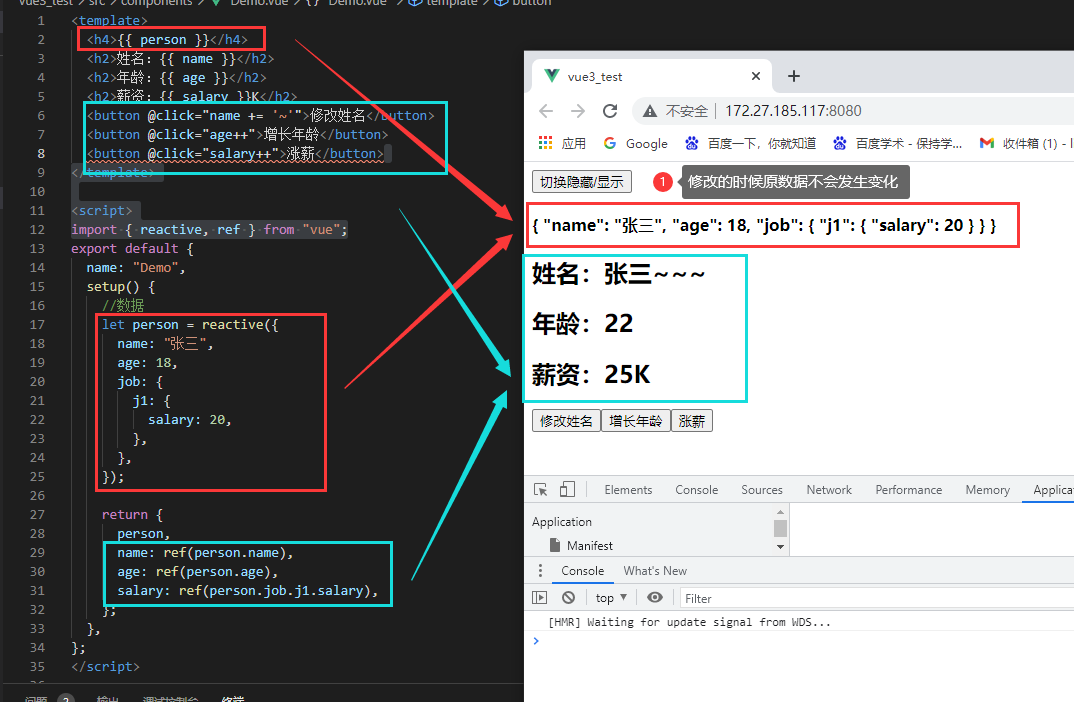<template> <h4>{{ person }}</h4> <h2>姓名:{{ name }}</h2> <h2>年龄:{{ age }}</h2> <h2>薪资:{{ salary }}K</h2> <button @click="name += '~'">修改姓名</button> <button @click="age++">增长年龄</button> <button @click="salary++">涨薪</button> </template> <script> import { reactive, ref } from "vue"; export default { name: "Demo", setup() { //数据 let person = reactive({ name: "张三", age: 18, job: { j1: { salary: 20, }, }, }); return { person, name: ref(person.name), age: ref(person.age), salary: ref(person.job.j1.salary), }; }, }; </script>