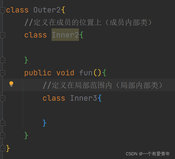 按照内部类在类中定义的位置不同,可以分为两种格式:成员内部类和局部内部类