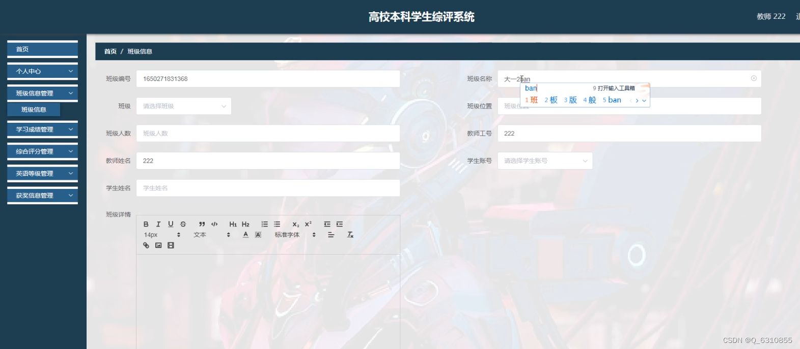 系统设计:设计大学总评系统的功能模块,如管理模块、数据录入模块、审核管理模块、结果查询模块等。管理模块主要包括主要实现班级学生的信息管理,体系比例以及系统的设定:数据录入模块主要实现班级学生的信息录入包括学习成绩以及综合素质的评分等:审核管理模块主要实现综合测评审核以及获奖情况审核两部分:结果查询模块。主要实现班级个人的综合测评分数报告等查询。