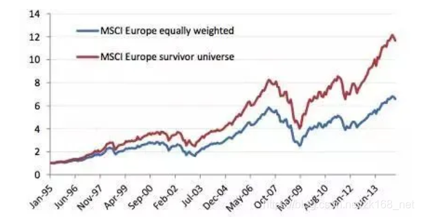 下图中显示了MSCI欧洲指数成分股等权重作为一个投资组合在过去的表现。蓝线为正确的投资组合,红线为存在幸存者偏差的组合。可以发现红线的投资回报率明显高于蓝线,从而使在回测时高估投资组合的收益。而更令人震惊的是,在做因子分析时,它有可能带来完全相反的结果。