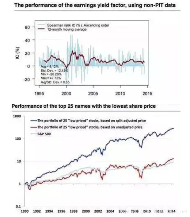 但是,当时点数据(Point-in-time data,简称PIT data)不可获得时,财务报告的滞后假设往往是错误的。下图即印证了采用PIT数据与非PIT数据所造成的差异。同时我们在下载历史宏观数据时往往得到的经过修正后的终值,但很多发达国家GDP数据发布后要经过两次调整,各大公司财报的修正也经常会进行修正。