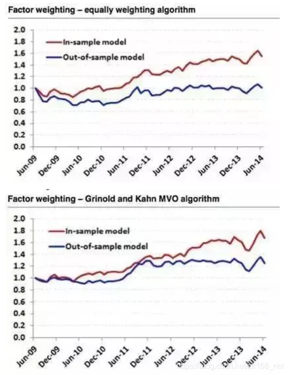 有时数据挖掘几乎是无效的。例如,对标普500指数采用两种不同的因子加权算法建模,选择2009-2014年数据进行回测。