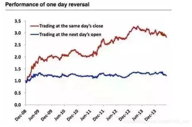 当每天收盘时买入当天表现最差的100个股票,卖出过去的持仓,持续每日交易,回报率非常高。这里的错误也是前视偏差,还没收盘我们并不知道当天哪些股票表现最差,即使用程序化交易,这种策略也是不可行。我们只能以每天开盘价买入昨天表现最差的100个股票。通过对比,以开盘价买入的策略几乎一条直线。