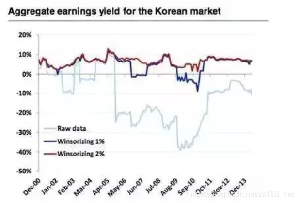 传统的异常值控制技术主要包括winsorization和truncation两种,数据的标准化也可近似看做异常值控制的方法之一,标准化技术有可能对模型的表现产生显著的影响。比如下图中的标普BMI韩国指数成分股的利润率,采用平均值、剔除1%、2%极值等方法的结果差异很大。宏观数据中经常出现此类问题,少数极值若不做预处理,会严重影响回归结果。
