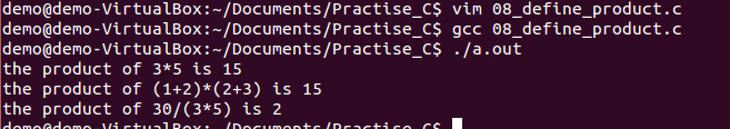 8 printf("the product of 30/(3*5) is %d\n",30/product(3,5));