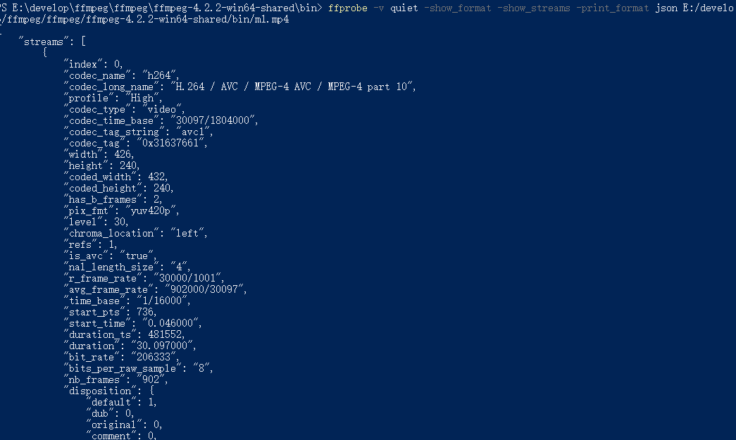ffprobe -v quiet -show_format -show_streams -print_format json E:/develop/ffmpeg/ffmpeg/ffmpeg-4.2.2-win64-shared/bin/m1.mp4
