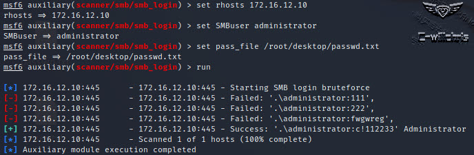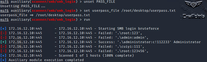 msf6 auxiliary(scanner/smb/smb_login) > set userpass_file /root/desktop/userpass.txt userpass_file => /root/desktop/userpass.txt #设置账号密码文件 msf6 auxiliary(scanner/smb/smb_login) > run #执行