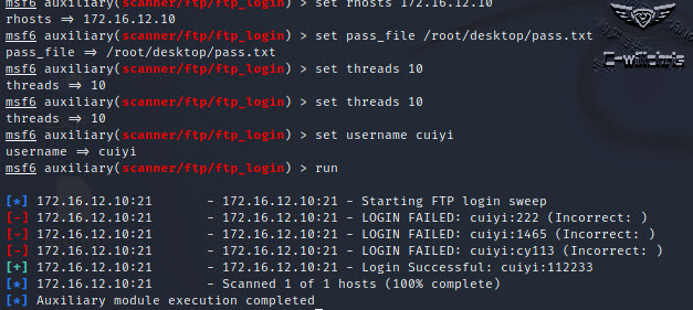 msf6 auxiliary(scanner/ftp/ftp_login) > set rhosts 172.16.12.10 #设置目标机IP
