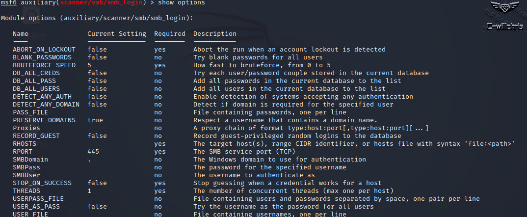 msf6 auxiliary(scanner/smb/smb_login) > unset PASS_FILE #取消密码文件