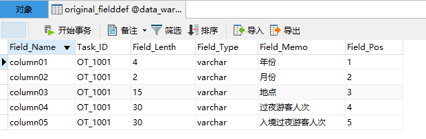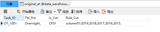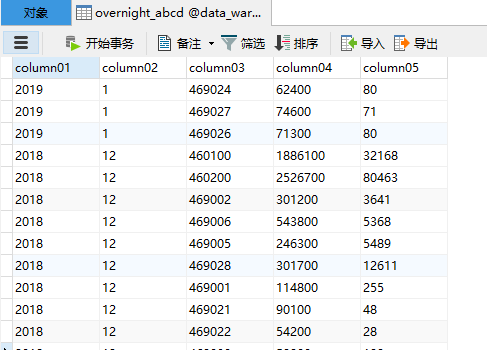 功能:对overnight_abcd根据column01字段的数据进行表切分,且分为overnight_2019、overnight_2018、overnight_2017、overnight_2016、overnight_2015表,同时替换overnight_abcd表中column03字段对应的行政区划代码为对应的中文名,接着,根据column01数据的值,将数据对应存入以'overnight_'开头+数据值的表。