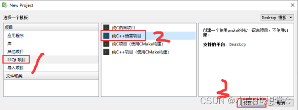 可以使用Qt Creator来创建纯C++语言项目,操作步骤如下: