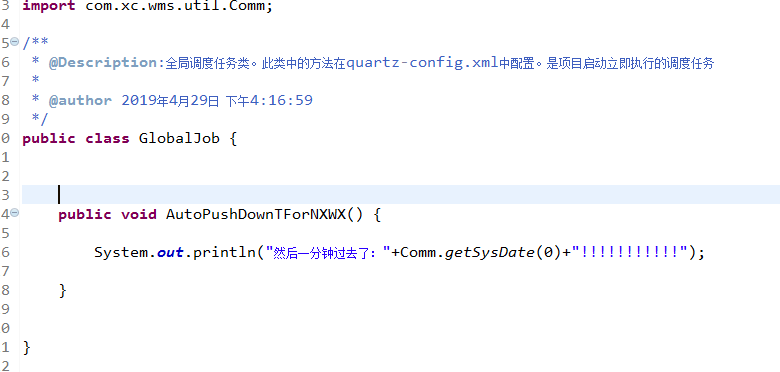 <?xml version="1.0" encoding="UTF-8"?> <beans xmlns="http://www.springframework.org/schema/beans" xmlns:context="http://www.springframework.org/schema/context" xmlns:tx="http://www.springframework.org/schema/tx" xmlns:xsi="http://www.w3.org/2001/XMLSchema-instance" xsi:schemaLocation="http://www.springframework.org/schema/beans http://www.springframework.org/schema/beans/spring-beans.xsd http://www.springframework.org/schema/context http://www.springframework.org/schema/context/spring-context-3.0.xsd http://www.springframework.org/schema/tx http://www.springframework.org/schema/tx/spring-tx-3.0.xsd" default-lazy-init="false"> <bean id="quartzJob" class="com.xc.wms.quratzJob.GlobalJob" /> <bean id="rsh_jobDetail_1" class="org.springframework.scheduling.quartz.MethodInvokingJobDetailFactoryBean"> <property name="targetObject"> <ref bean="quartzJob" /> </property> <property name="targetMethod"> <value>AutoPushDownTForNXWX</value><!-- 方法名称 --> </property> </bean> <!-- CronTrigger——调度触发 使用cron表达式--> <bean id="rsh_cronTrigger_1" class="org.springframework.scheduling.quartz.CronTriggerFactoryBean"> <property name="jobDetail" ref="rsh_jobDetail_1" /> <property name="cronExpression"> <value>0 0/1 * * * ? *</value> <!-- <value>0 0 0 * * ? *</value> --><!-- 每天晚上0点执行 --> </property> </bean> <!--SimpleTrigger——调度触发 --> <!-- <bean id="rsh_simpleTrigger1" class="org.springframework.scheduling.quartz.SimpleTriggerFactoryBean"> <property name="jobDetail" ref="rsh_jobDetail_1" /> <property name="startDelay" value="500" /> <property name="repeatInterval" value="0" /> <property name="repeatCount" value="0" /> </bean> --> <bean id="startQuertz" class="org.springframework.scheduling.quartz.SchedulerFactoryBean"> <property name="triggers"> <list> <!-- <ref bean="rsh_simpleTrigger1" /> --> <ref bean="rsh_cronTrigger_1" /> </list> </property> </bean> </beans> |