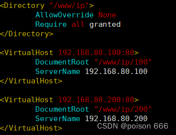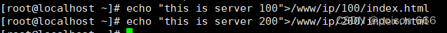 7.给100,200两个文件添加网页内容:echo"this is server 100" >/www/ip/100/index.html