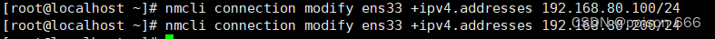 1.建立两个IP地址:nmcli c modefiy ens33 +ipv4.address 192.168.80.100/24