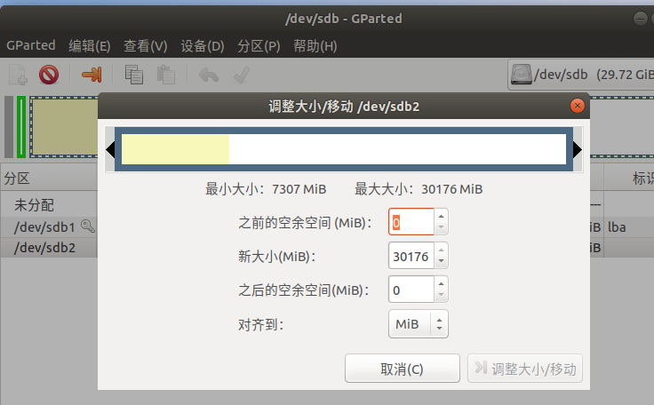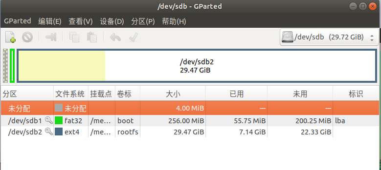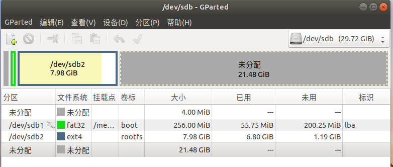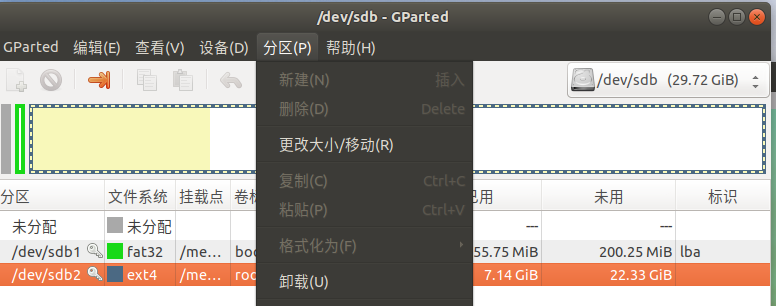 在终端输入gparted /dev/sdb 打开挂载的sd卡