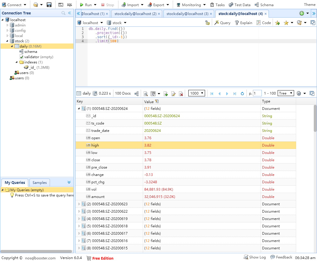 最后,将这些股票数据写入到MongoDB中: