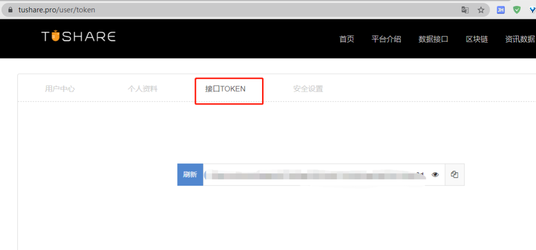 你需要到 https://tushare.pro/ 上注册一个tushare账户,然后进入账号页面拿到token: