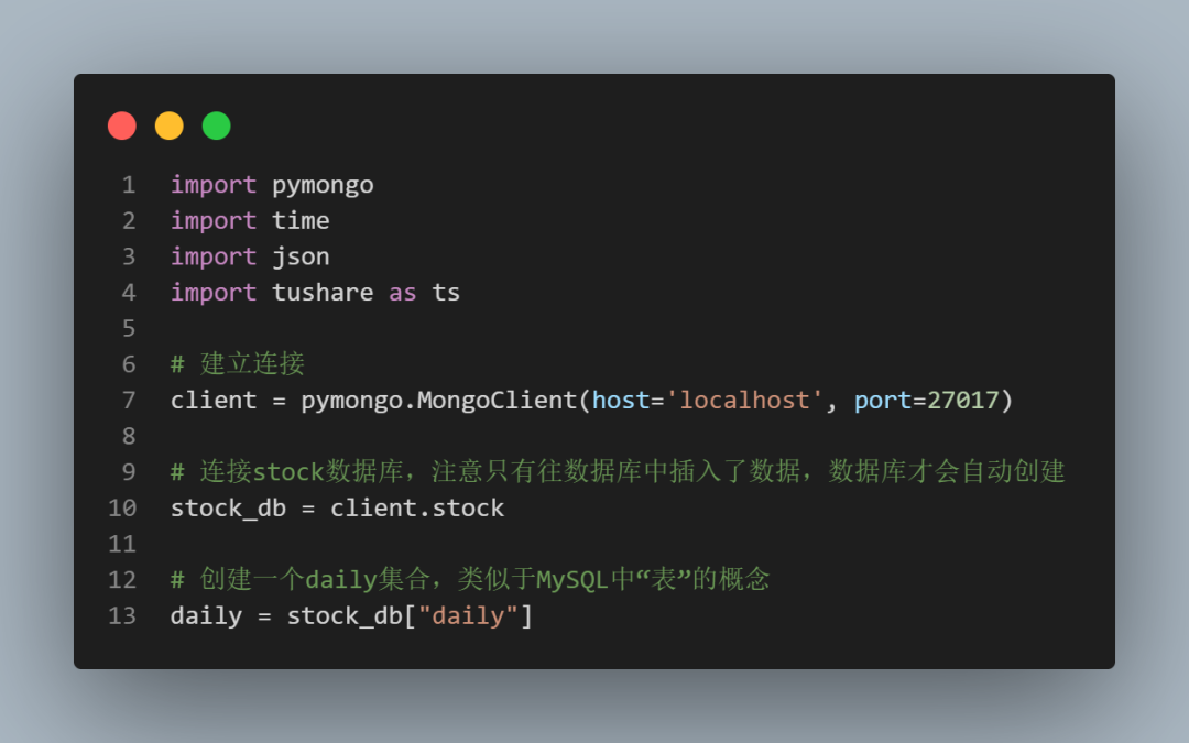 首先,学会连接MongoDB数据库并创建集合(表),也就4行代码的事情: