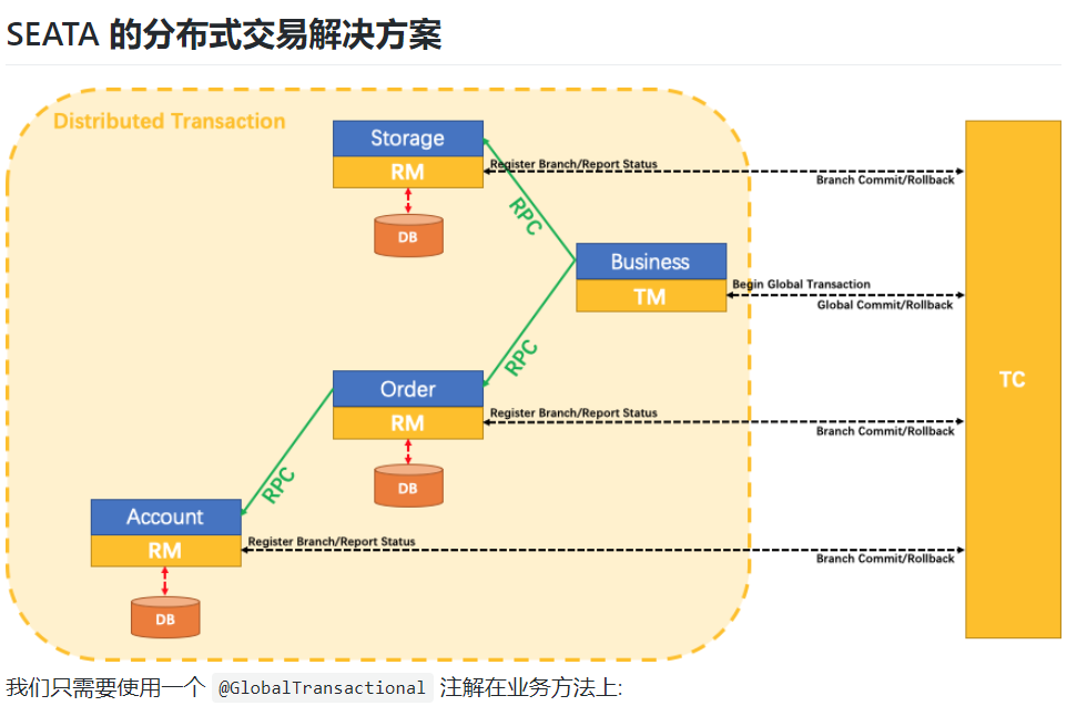 - 按业务场景,编排数据库、服务等事务内资源(RM 向 TC 汇报资源准备状态);