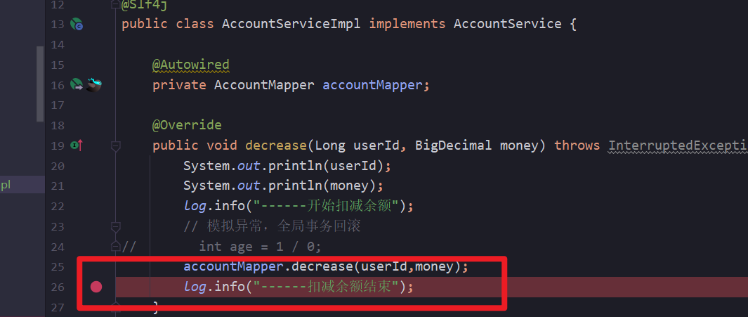 @Overridepublic void decrease(Long userId, BigDecimal money) throws InterruptedException { System.out.println(userId); System.out.println(money); log.info("------开始扣减余额"); // 模拟异常,全局事务回滚 int age = 1 / 0; accountMapper.decrease(userId,money); log.info("------扣减余额结束");}