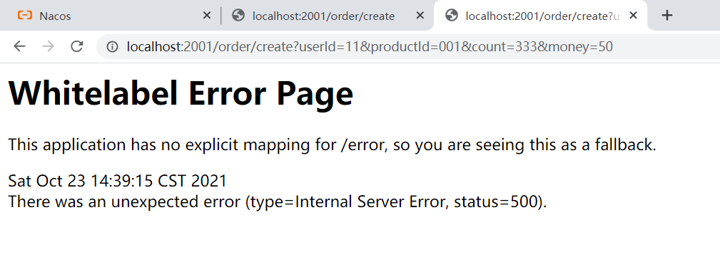 在浏览器中输入 http://localhost:2001/order/create?userId=1&productId=001&count=222&money=50,