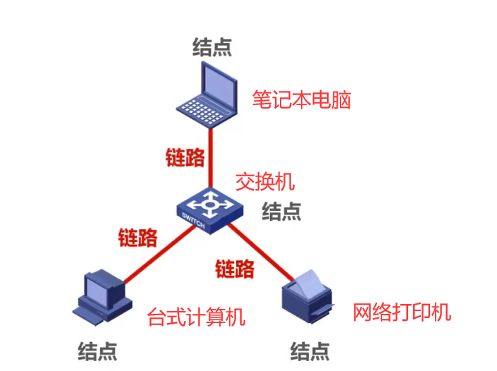 - 网络由若干结点(Node)和连接这些结点的链路(Link)组成。如图所示,4个结点和3段链路(可以是有线链路,也可以是无线链路)就构成了一个简单的网络。