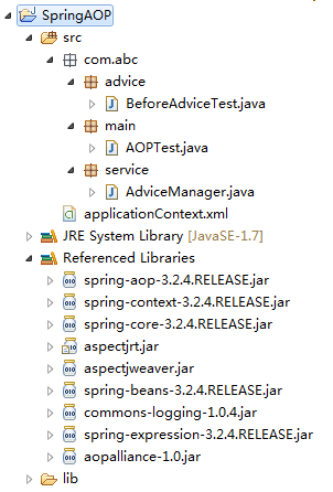 为了在Spring应用中启动@AspectJ支持,还需要在用用的类加载路径下增加两个AspectJ库:aspectweaver.jar和aspectjrt.jar,直接使用AspectJ安装路径下的lib目录下的这两个Jar文件即可,当然,也可以在Spring解压缩文件夹的lib/aspectj路径下找到它们。下面是项目内容的截图: