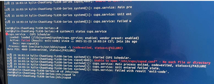 如果运行异常,根据报错提示更改即可,如上图是缺少/etc/cups/cupsd.conf文件,从另一台麒麟系统上将/etc/cups下的文件对应补全后重启cups服务即可