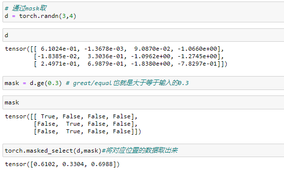 需要先根据数据生成一个mask,比如挑选出大于等于0.3的数,此时会得到一个和数据相同形状的,满足条件位置是1,不满足条件的位置是0的一个mask,通过masked_select可以选出数据。