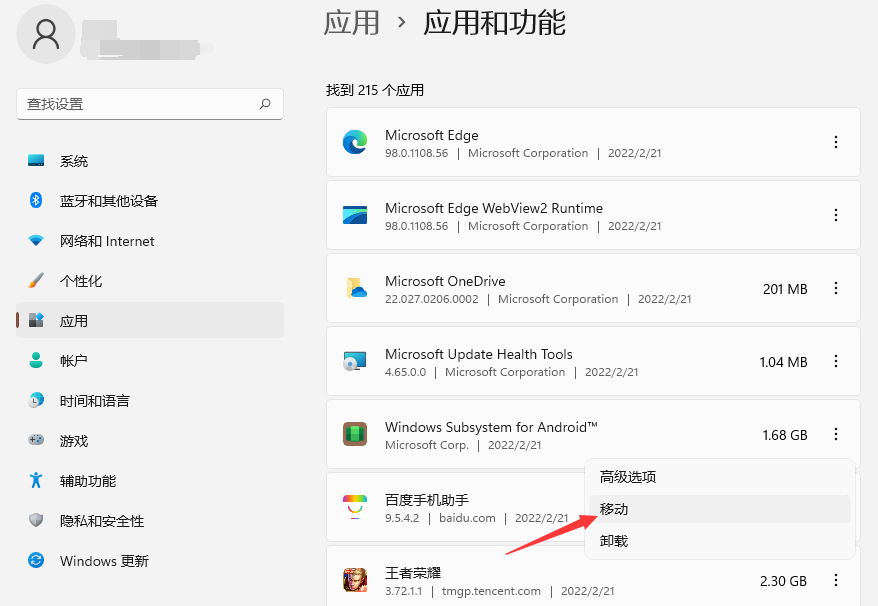 2、WSA默认是安装在C盘的,那么子系统中的所有App也都是在C盘的,可以在设置-应用中将WSA移动到一它盘中,以免C盘空间不足。