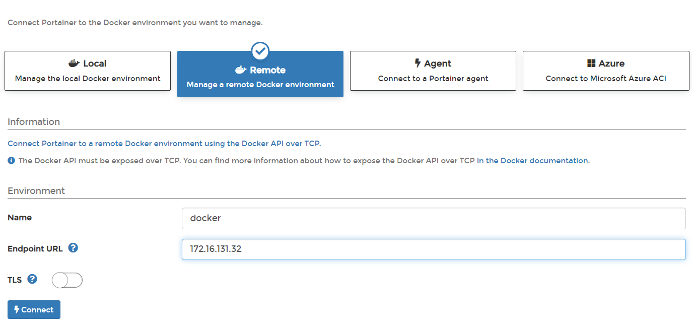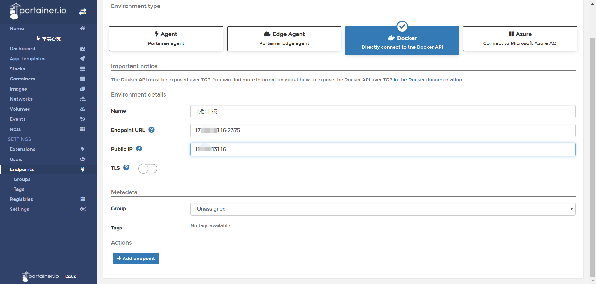 4、输入docker的名称,IP地址:端口,IP地址单击“Add endpoint”