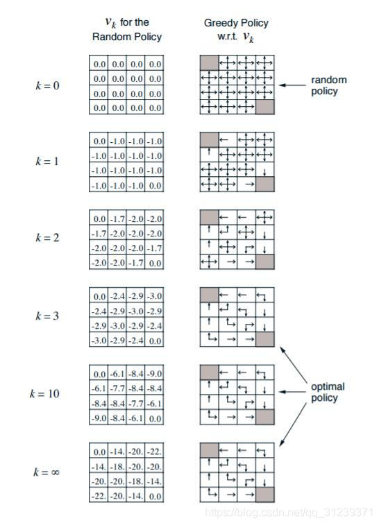 因为在Grid World的例子中,所有可行的的状态转化概率P=1,瞬时奖励都是-1,衰减因子定义为γ=1,所以其实Q函数的值就是下一个状态的状态值,这也就是为什么直接往状态价值最大的那个状态移动就可以的原因。